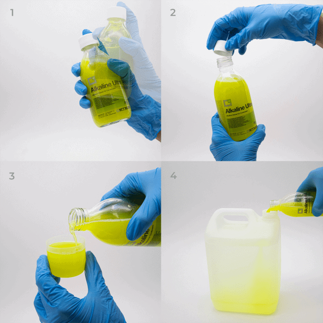 - Dilute the product 1:20 in a container with the right quantity of water (water first) and shake